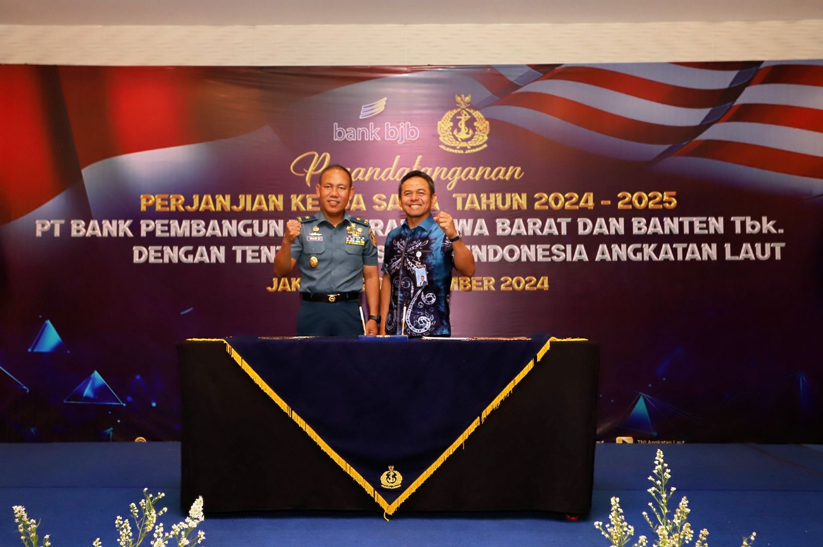 Acara penandatanganan PKS berlangsung pada Rabu, 20 November 2024, bertempat di Meeting Room Aster 1 Avenzel Hotel dan Convention Cibubur, Jakarta, dihadiri oleh perwakilan dari bank bjb dan TNI AL. Acara dimulai pukul 09.00 WIB dengan sesi registrasi dan persiapan, dilanjutkan dengan agenda sambutan, serta penandatanganan dokumen kerja sama oleh Direktur Konsumer dan Ritel bank bjb Yusuf Saadudin dan Kadiskual – Laksamana PertamaTNI Imam Subarkah S.E., M.M., CFrA., CRMP turut dihadiri olehjajaran manajemen bank bjb beserta jajaran TNI AL.